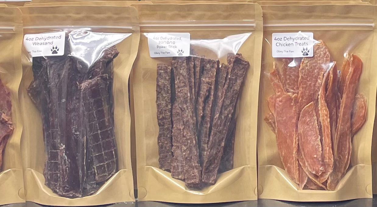 The Greatest complete treat. Based on a prey model diet. (80% muscle meat, 10% bone, 5% beef liver, 5% beef kidney.) Every pup’s favorite! Boneless beef, boneless pork sirloin, chicken necks, beef liver, and beef kidney. Minimally processed; ground, frozen, cut, & dehydrated.